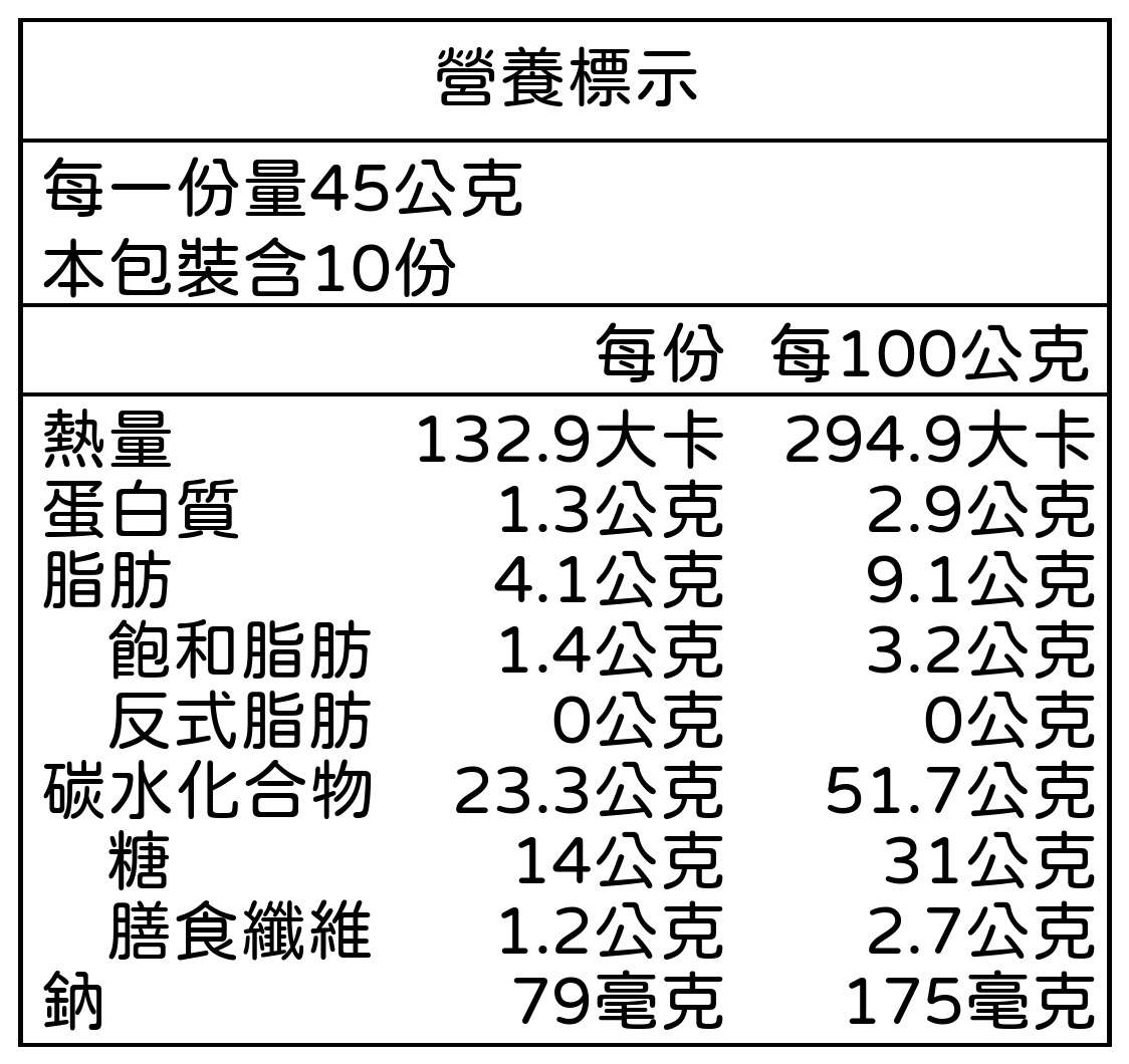 糖霜:糖、玉米澱粉、磷酸二澱粉、天然香料