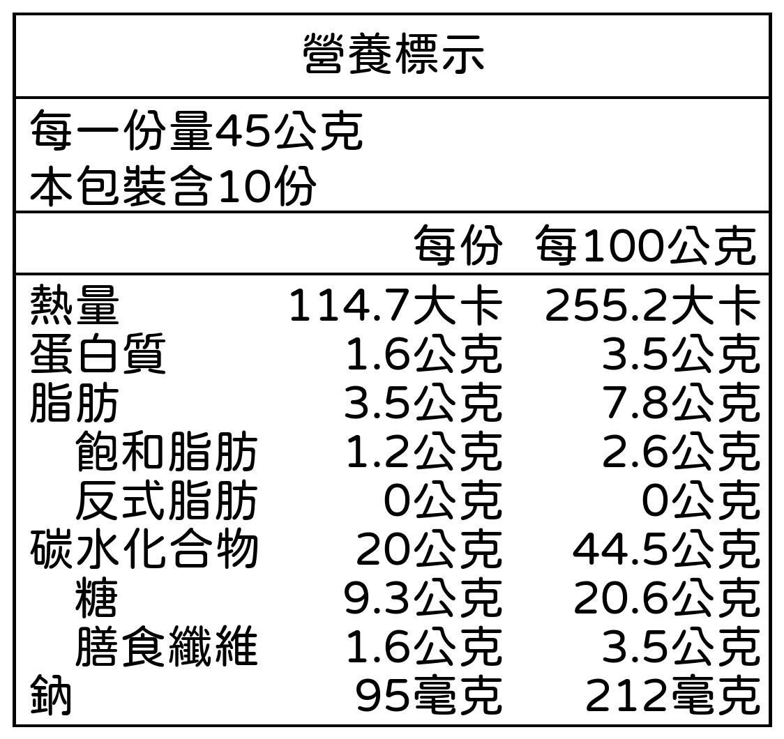 碳酸氫鈉、葡萄糖酸-δ內酯、關華豆膠、玉米糖膠、肉桂、竹纖維、天然香蕉香料、鹽、肉荳蔻