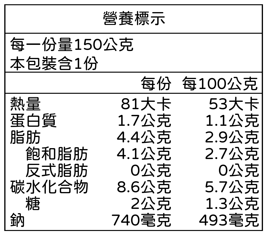 椰漿(天然椰漿99.9%、玉米糖膠E415、關華豆膠E412)、水、綠咖哩膏(綠辣椒、大蒜、香茅、紅蔥、鹽、良薑、葵花油、芫荽葉、芫荽籽、椰糖、麻瘋甘葉、芫荽根、馬芹籽、薑黃、萊姆汁)、杏鮑菇、辣椒、糖