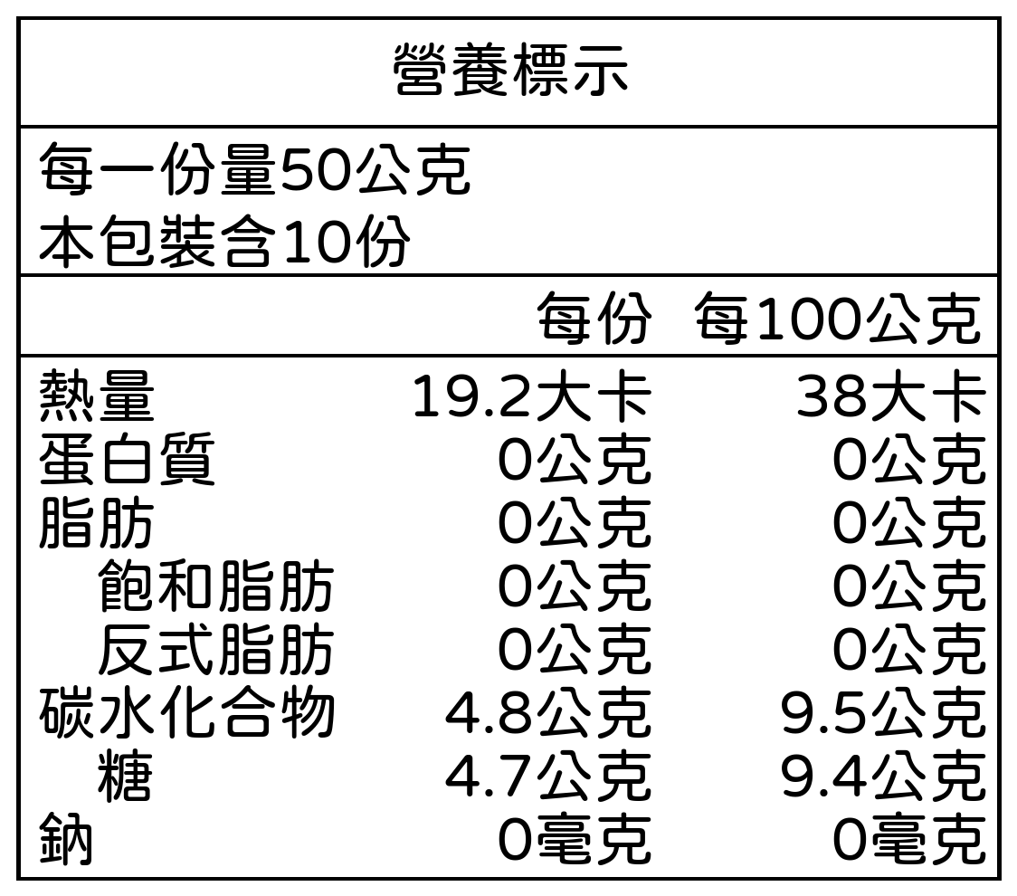 糖、濃縮蜜桃汁、濃縮百香果汁、檸檬酸、維生素C(抗氧化劑)、天然水蜜桃香料