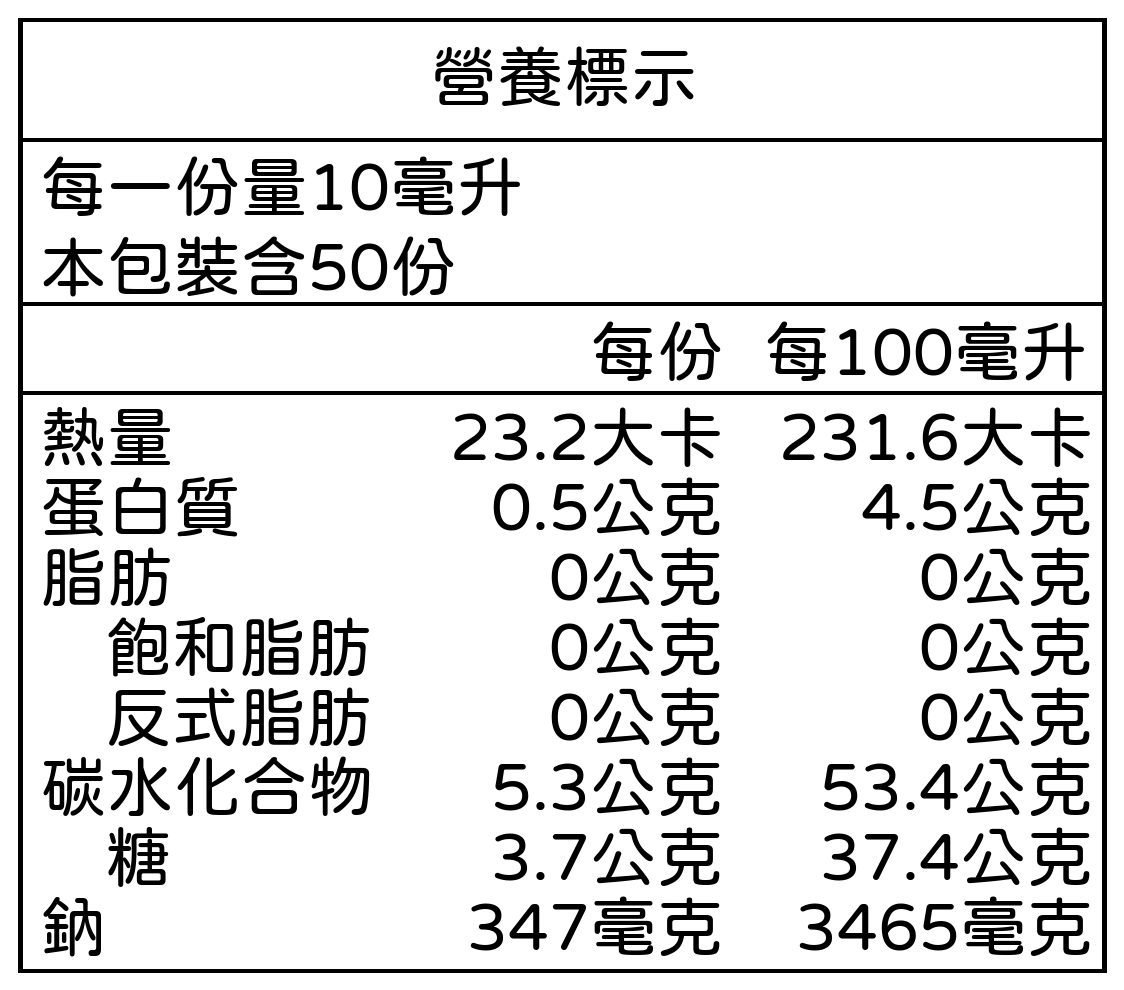 醬油(脫脂大豆、小麥、鹽)、糖、米發酵調味料(麥芽糖、高果糖漿、糖、米、食用酒精、鹽、麴菌、檸檬酸)、水、食用酒精、鹽、L-麩酸鈉、5'-鳥嘌呤核苷磷酸二鈉、 5'-次黃嘌呤核苷磷酸二鈉、複合調味料(L-麩酸鈉、DL-胺基丙酸、L-天冬胺酸、胺基乙酸、5'-鳥嘌呤核苷磷酸二鈉、 5'-次黃嘌呤核苷磷酸二鈉、水解蛋白(小麥、大豆)、糊精、鹽)、魚露(沙丁魚、鹽)、焦糖色素(亞硫酸-銨鹽焦糖)、甘草