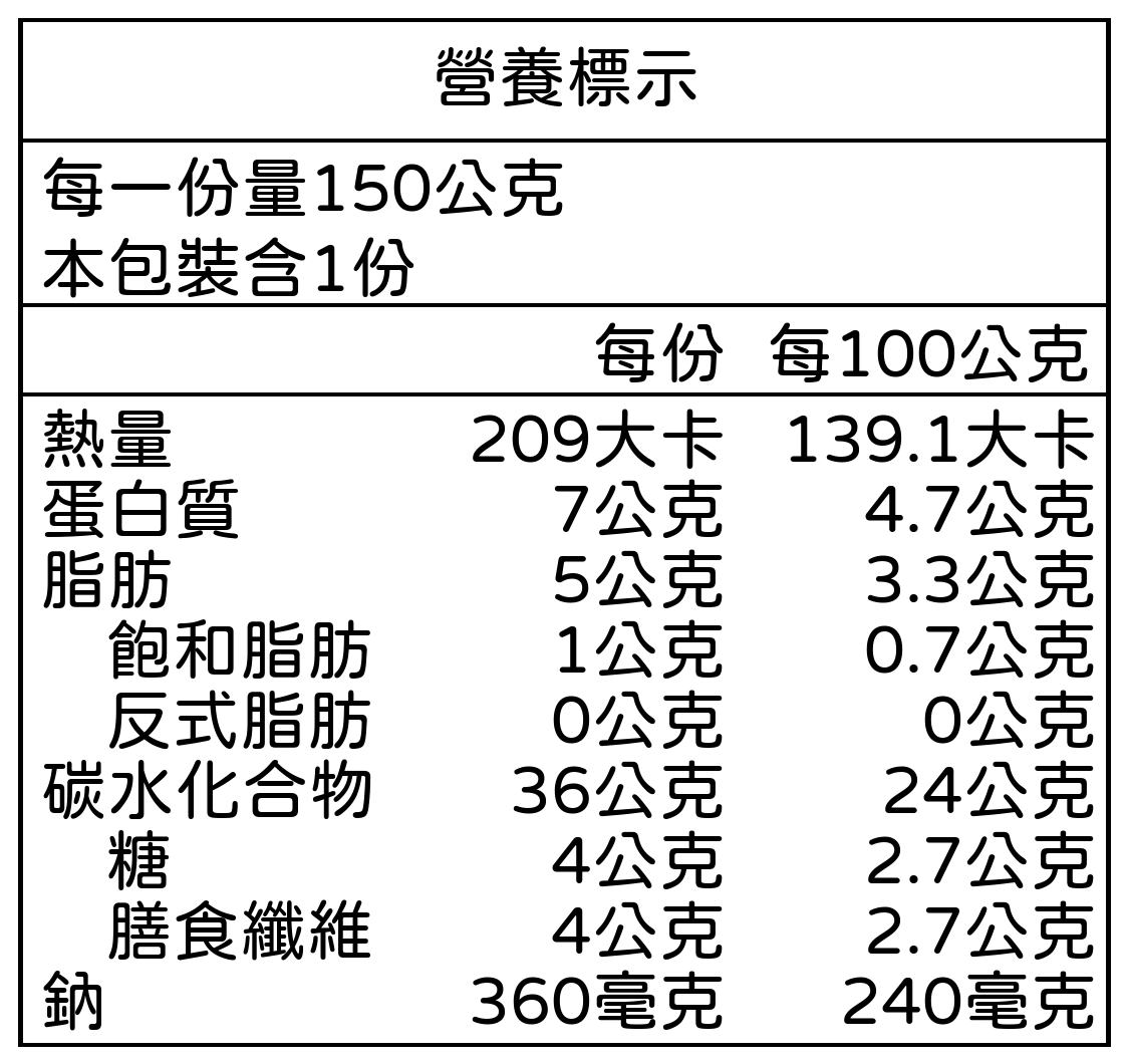 煮熟藜麥(水、藜麥)、水、玉米、紅蘿蔔、豌豆、玄米油、糖、鹽、酵母萃取物、辛香料(胡椒粉)